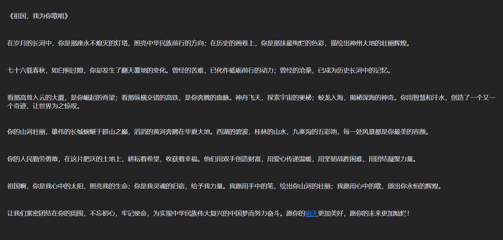 为弘扬爱国主义精神,激发当代大学生的爱国情怀与历史使命感,将宏大的“爱国”主题转化为个人的、具体的感受和故事,习近平新时代中国特色社会主义思想研究社特于2025年9月25日至9月28日开展了“笔绘山河,诗颂祖国”——国庆诗文征集活动。